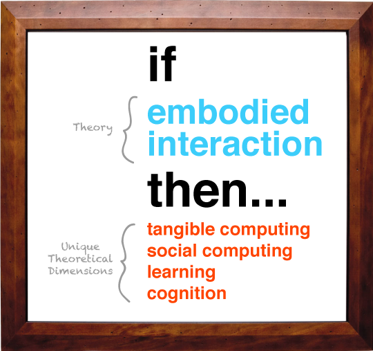 Embodied interaction suggests that we should view technology not just as a series of mental interactions, but also as physical interactions. As Dourish (2001) puts it, “Embodied Interaction is interaction with computer systems that occupy our world, a world of physical and social reality, and that exploit this fact in how they interact with us.” Dourish also references “Tangible Computing,” a term that means several different computational devices responding to each other as their location in the physical world changes. These computational devices can be computers as we generally think of them (laptops, printers, phones, etc.), but they can also be everyday things that have been augmented with computational power (paper, furniture, clothes, etc.). Tangible computing in the extreme would mean that anything you interact with could have an effect on your data and we would no longer need a mouse or GUI. Embodied interaction also looks at how technologies can create “Social Computing,” which is “…to incorporate understandings of the social world into interactive systems.” (Dourish, 2001).